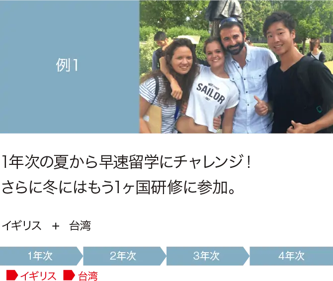 留学プログラムは、目的や語学レベル、期間も幅広く設定されているので自分に合ったプログラムやキャンパスを組み合わせて、在学中に何度も世界中のキャンパスで学ぶことができます。世界中のキャンパスで学び、自分の可能性を広げましょう!