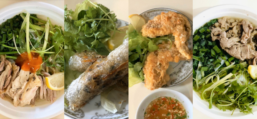 写真の料理は左から鶏肉のフォー、揚げ春巻き、揚げ手羽先、牛肉のフォー