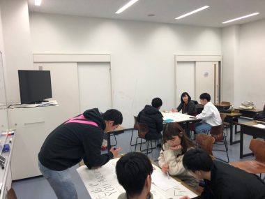 最初はぎこちない感じでのスタートでしたが、先輩学生や学生会メンバーが積極的に関りコミュニケーションがよくなり色々なアイデアや意見がでるようになりました。数時間の議論を経てプレゼン用に模造紙に各グループのアイデアや方策を書き上げました。プレゼンでは本学を良くしたいと言う学生の生の声がたくさん込められた場となりました。
