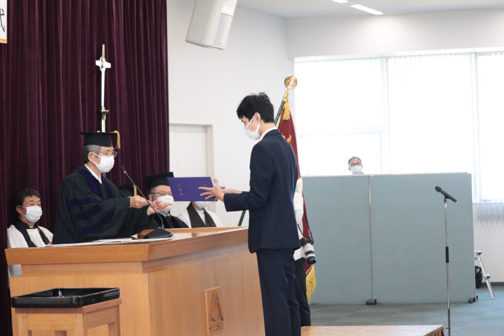 式辞の後、卒業生を代表して総代の学生へ学位記が授与されました。卒業生のために祈りが捧げられ、2022年度後期の経済学部学位記授与式が終了しました。