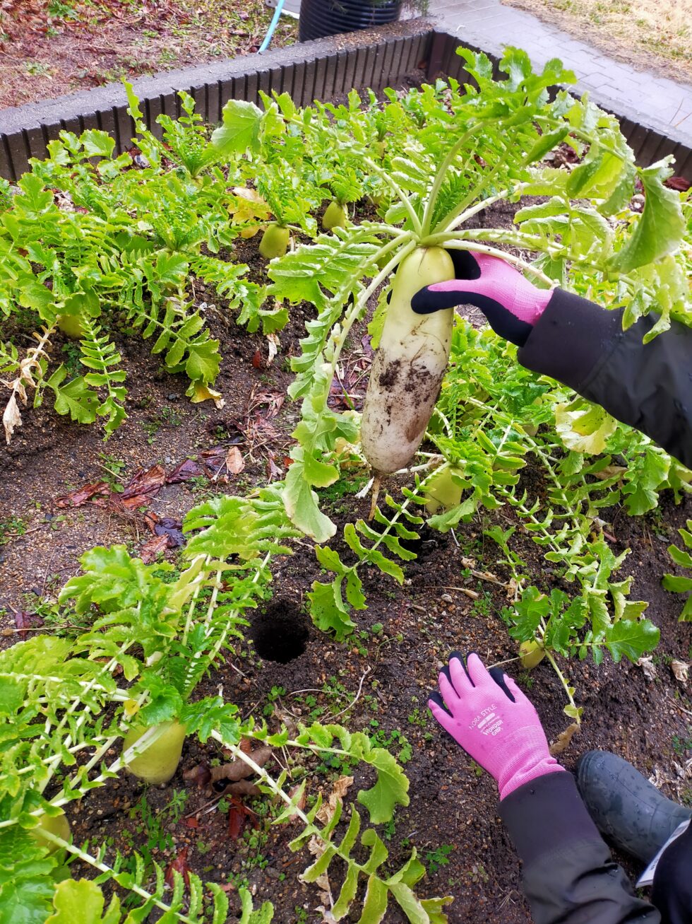 2月14日(月)の朝、「KIU Farm」で栽培している大根を収穫し、本学食堂スカイコートに提供いたしました。