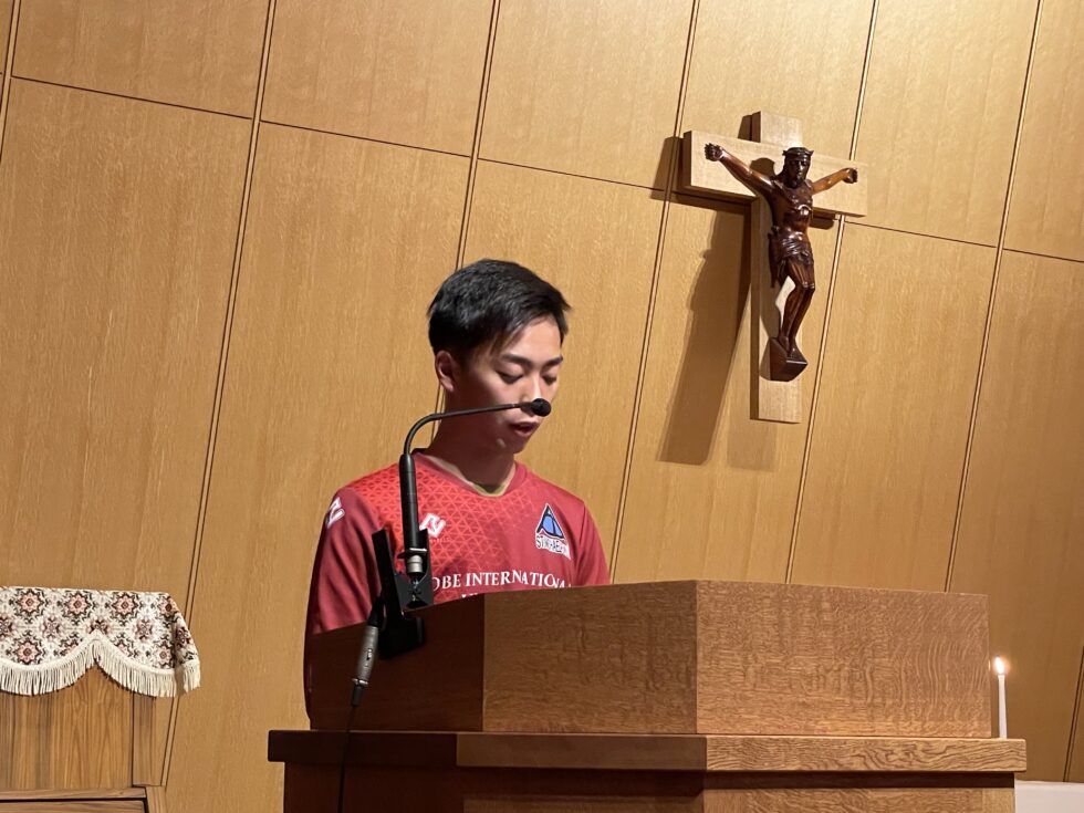 学生会の進行のもと、感謝礼拝が進められました。與賀田チャプレンによる聖書朗読から始まり、その後、副学長の下田先生から奨励のお言葉がありました。社会人基礎力(経済産業省)として、前に踏み出す力・考え抜く力・チームで働く力 この3つの力が仕事をしていくために必要な基礎的な力だと提唱されています。体育会の学生の皆さんはスポーツを通して、すでに実践していることだと思います。皆で力を合わせ、目標に向かって努力していること、特にチームで働くことを意識して、今後も活躍して欲しいと学生達にエールを送っていました。