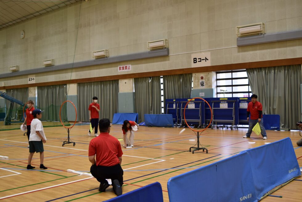 5メートル先のゴール(丸い輪)に向かってディスクを投げる競技。10枚投げて何枚入るのかを競います。