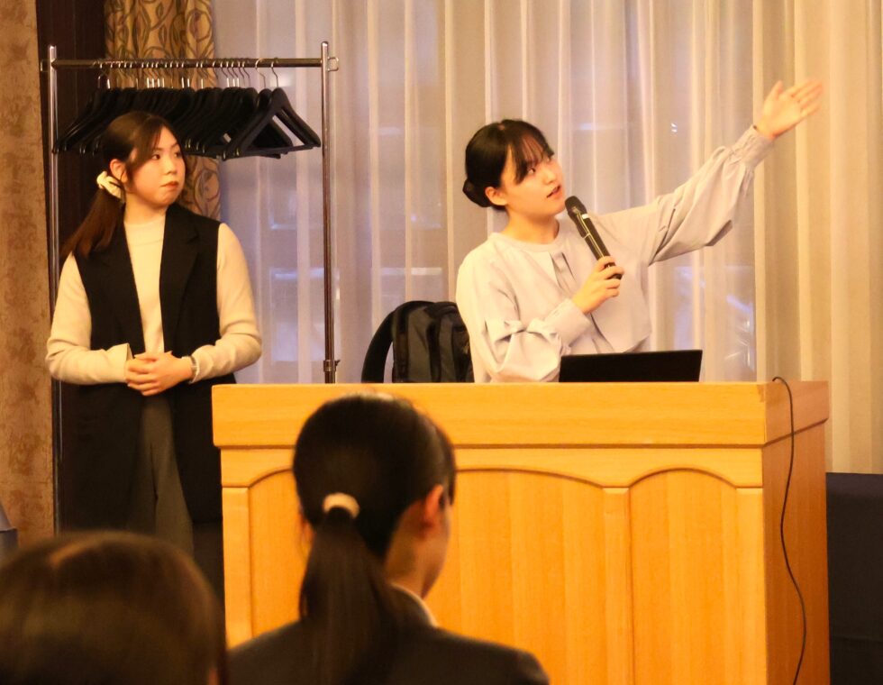 講義した学生は同学部国際文化ビジネス・観光学科3年の河合彩音さん(20)=兵庫県加古川市出身=と南部穂乃花さん(21)=神戸市出身=。2人もホテル業界への就職を視野に入れて勉強中で、ともに同市内の一流ホテルでアルバイトしてフロント業務などに取り組んでいる。自身が経験している接客方法などを生徒たちに細かく伝授した。