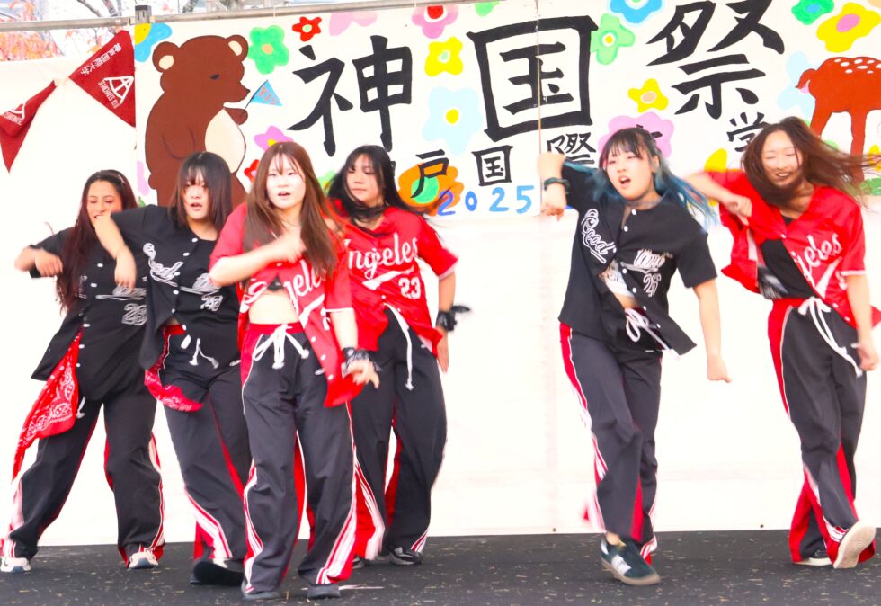 ステージパフォーマンスでは学生や留学生の歌やKpopダンスサークルによるダンスパフォーマンス、軽音楽部のスペシャルライブなどのほか、神戸発のアイドルユニット「KOBerrieS(コウベリーズ)」のミニライブが行われた。消防団のPRでは女性お笑いトリオ「森三中」の黒沢かずこさんらが登場してステージを盛り上げた。イベントの締めを務めた「よしもとお笑いライブ!!」ではお笑いコンビ「サバンナ」の八木真澄さんがMCを務め、「空前メデオ」「マーメイド」「もも」さんらのお笑いコンビが登場して笑いを誘った。