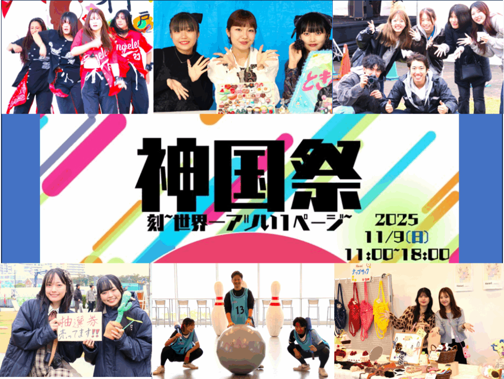 本学学生が地域の人たちと交流を図る恒例の神国祭が11月9日に行われた。早朝から雨が降りしきる悪天候となり、午前11時の開場時も冷たい雨が落ちていた。しかし、学生たちは23店舗の模擬店で焼きそば,鶏のから揚げ、焼き鳥、フランクフルトなどの食べ物系のほか、輪投げ、千本引きなどの遊べる系などで盛り上げていた。6号館では人気のお化け屋敷、2号館では日本語、英語によるスピーチコンテストも行われた。