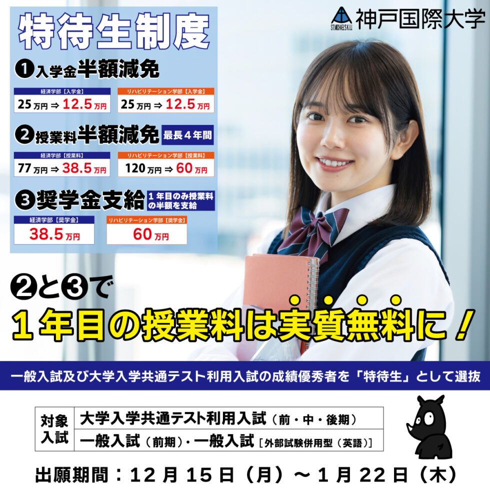 一般入試の時期が迫ってきました!神戸国際大学では「一般入試(前期)」・「大学入学共通テスト利用入試(前期)(中期)(後期)」を実施、成績優秀者の方には特待生制度があります。