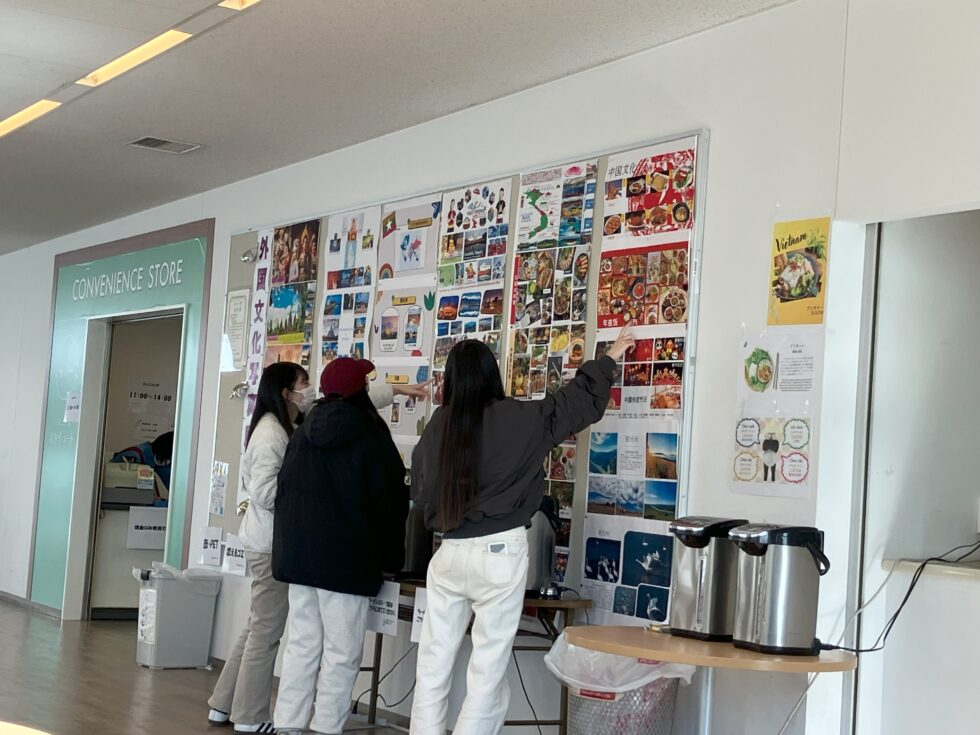 学生食堂スカイコートの2階で、中国、ベトナム、ネパール、ミャンマー、スリランカ、インドネシアの6ヵ国の留学生たちが母国の食文化・観光地・お祭り等を紹介する写真をまとめ、展示しました。在学生の皆さんは写真を通して、知らなかった国の風景、人々の表情、伝統衣装、食べ物などを見ることで、新鮮な驚きや発見がたくさんあったことでしょう。