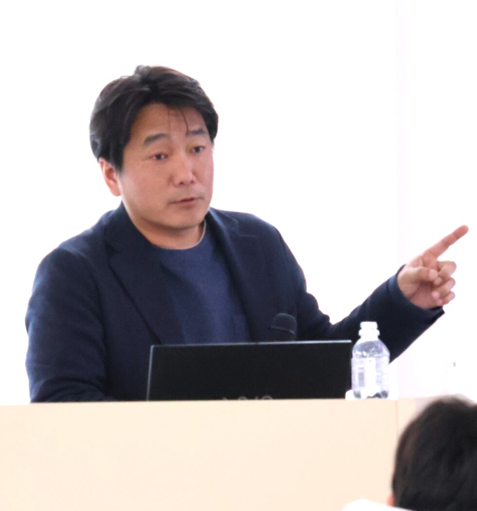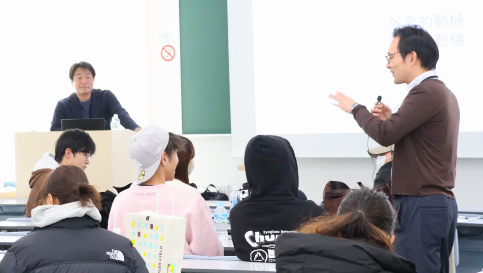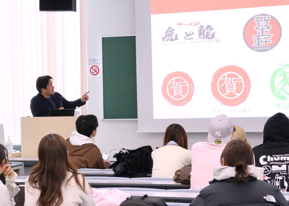 経済学部の鍋嶋正幹准教授が教える「飲食産業論」の授業で、兵庫県内に6店舗を構える「神戸豚骨ラーメン賀正軒」を運営する株式会社NIM代表取締役の福田泰三さんをゲスト講師に招いた講義が12月22日に行われた。