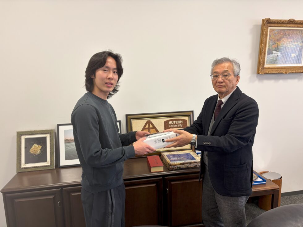 2026年福男「二番福」、優秀選手賞の澤井くんへ学長より記念品贈呈がありました。