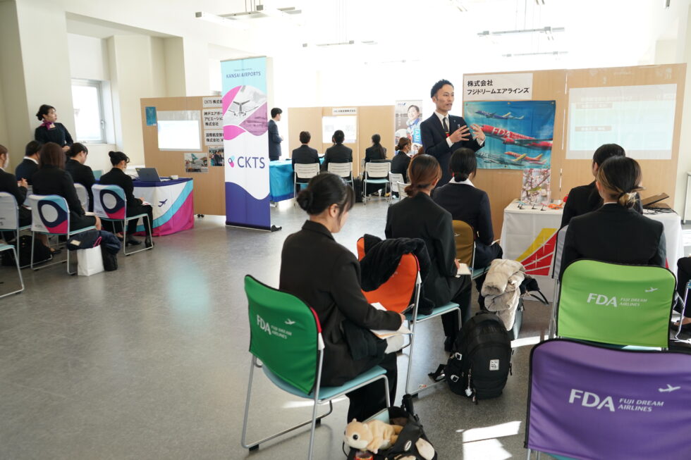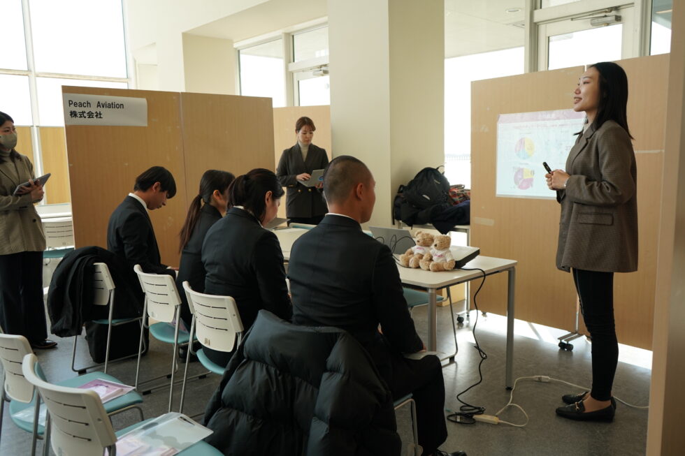 1月22日㈭、本学では初めてとなるエアライン業界限定の「KIU学内企業説明会」を開催し、5社の企業様にご参加いただきました。当日は1年生から3年生までの、日本人・留学生合わせて32名が参加し、熱心にメモを取り質問をする姿が見られ、業界理解や各企業の特徴、求める人材像への理解を深める機会となりました。