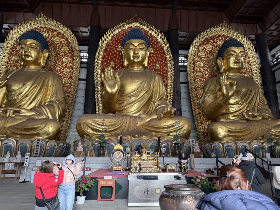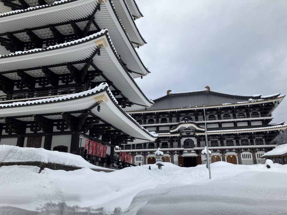 その後、但馬大仏(長楽寺)を参拝しました。世界最大級の木彫金箔座像三大佛の大きさには驚きの声を上げていました。五重塔にも大仏殿にも多くの雪が積もっていて、特別な空間を見ることができました。