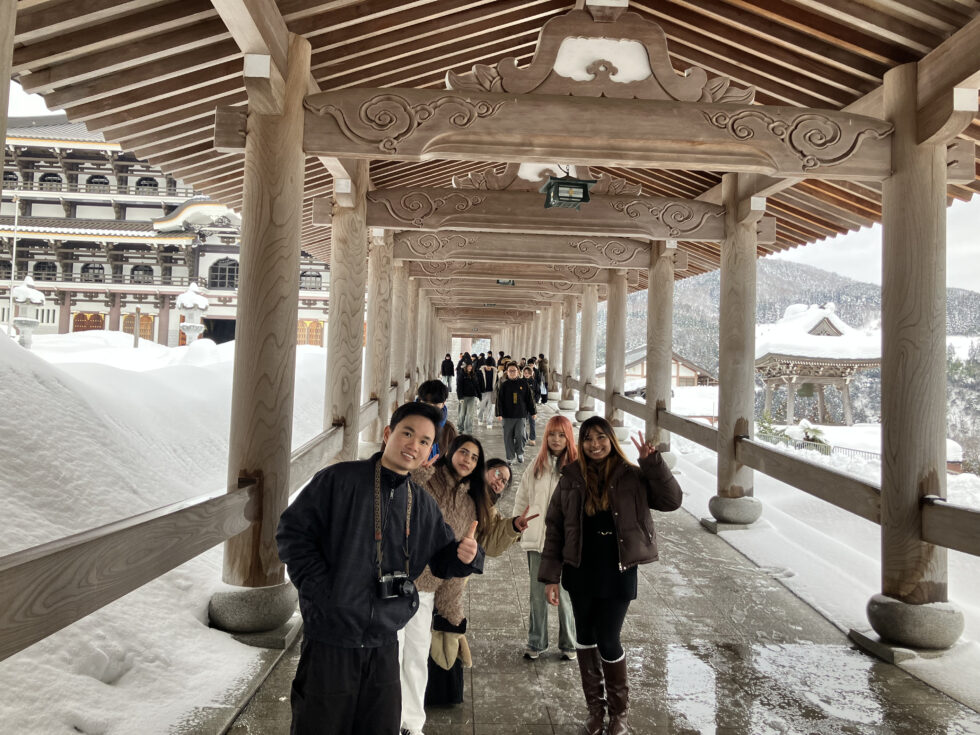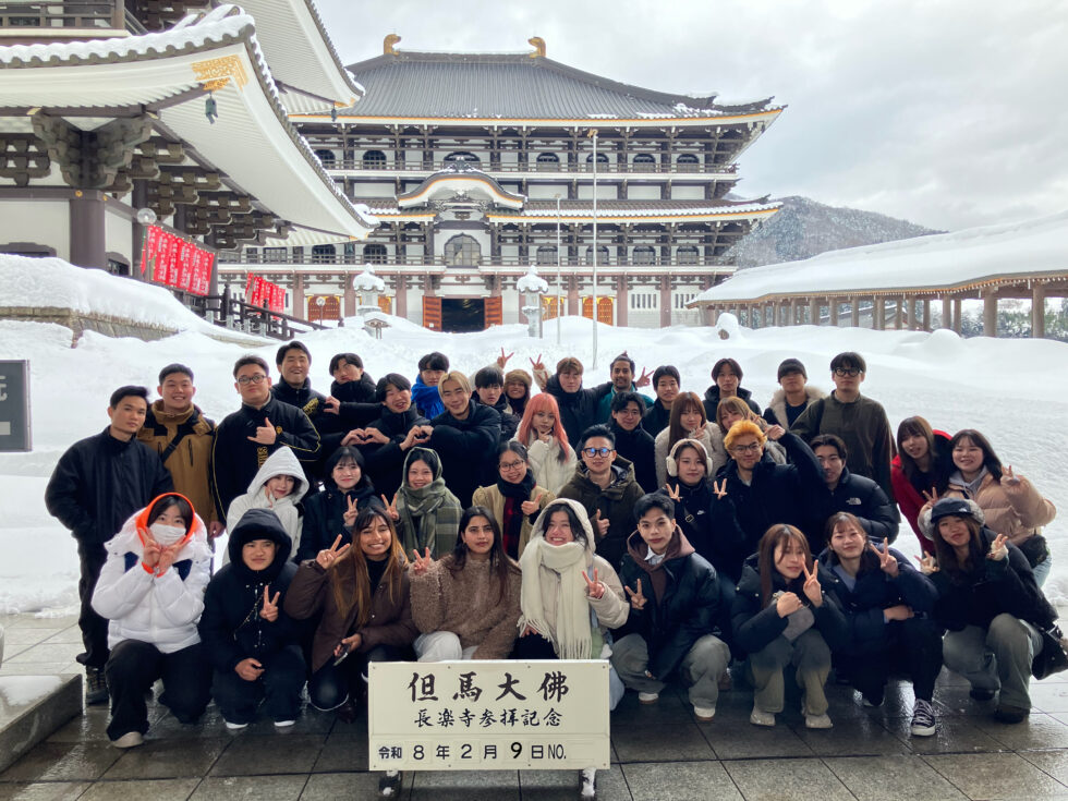 2月9日(月)~10日(火)の1泊2日の日程で「学生会主催2025年度異文化交流バス研修旅行」を実施しました。この研修ツアーは、企画運営から実施まですべて学生会が主体となって行いました。今回で12回目の開催となり、日本人学生19名、留学生19名の合計38名が参加しました。今年度の研修は、兵庫県香美町での但馬大仏(長楽寺)への参拝とハチ高原でのスキー・スノーボード体験を実施しました。