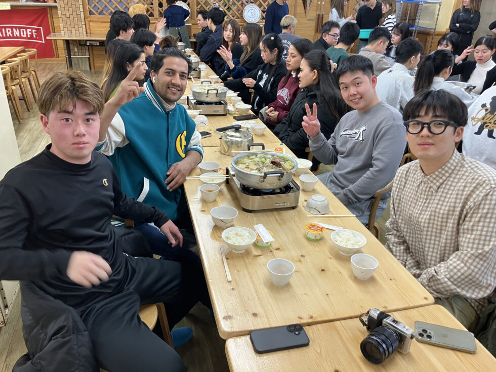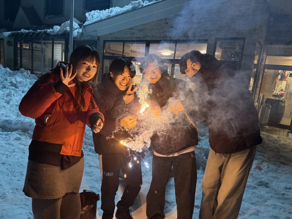 ホテルに到着後は、すき焼きとかも鍋をいただいた後、学生会が企画した交流を深めるレクリエーションを行い、大いに盛り上がりました。最後に、みんなで雪の中で花火をしました。行程は変更となってしまいましたが、その時間を取り戻すかのように会話が弾み、有意義な時間を過ごすことができました。