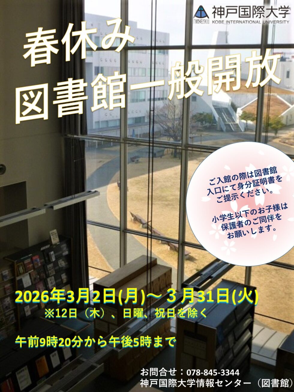 神戸国際大学では2026年3月2日(月)~3月31日(火)までの期間、大学図書館を一般の皆様に開放いたします。