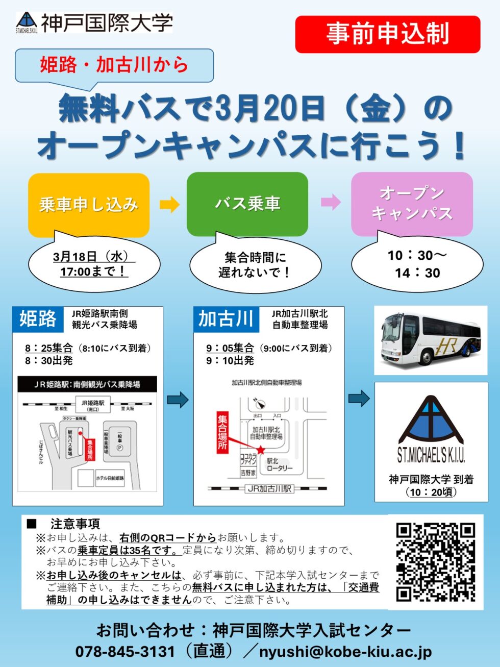 神戸国際大学では、3月20日(金・祝)に開催されるオープンキャンパスについて、姫路・加古川方面から参加される高校生・保護者の皆さまがご乗車いただける無料バスを運行します。バスは、JR姫路駅からJR加古川駅を経由して、オープンキャンパス開始10分前の午前10時20分頃、神戸国際大学に到着します。