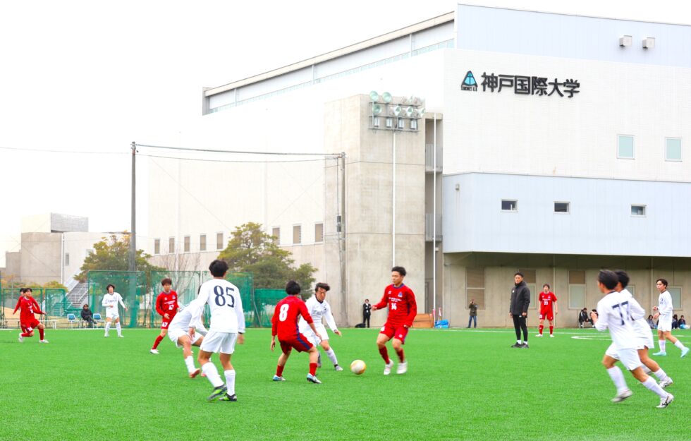 親善試合で対戦した神戸国際大(赤)と桃山学院大(白)のサッカー部の選手たち
