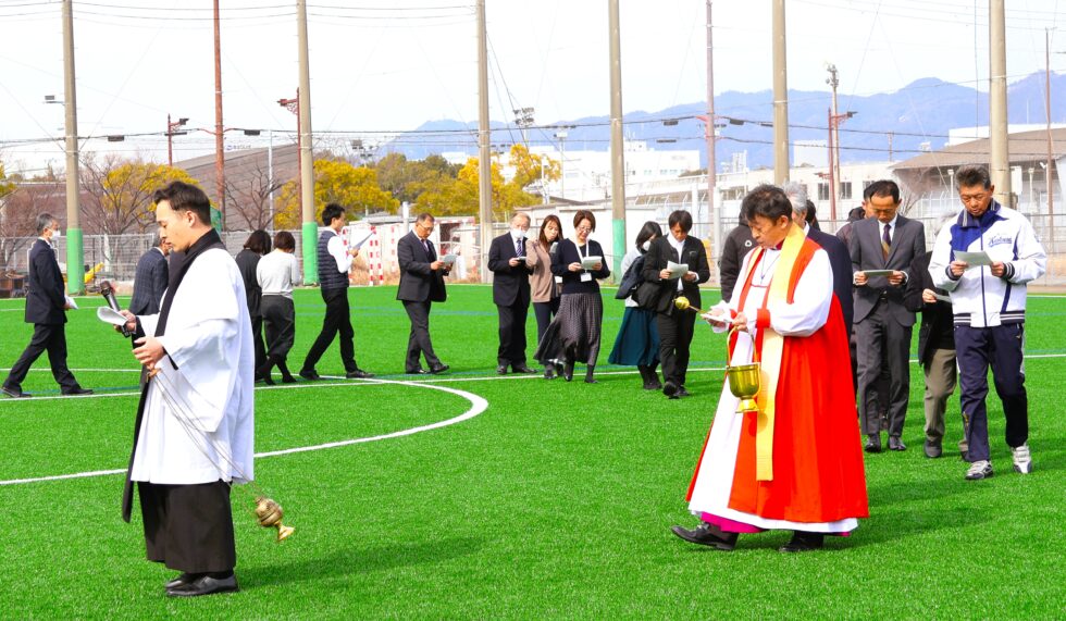 本学のグラウンドが人工芝グラウンドに生まれ変わり、その竣工式が2月27日に実施された。はじめに「新グラウンド 祝福式」が行われ、教職員や学生会、サッカー部、野球部など学内関係者や施工会社の代表らが出席。司式者の先導で参加者が真新しい人工芝の上を歩きながら、祈りを唱えた。
